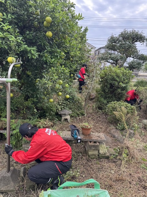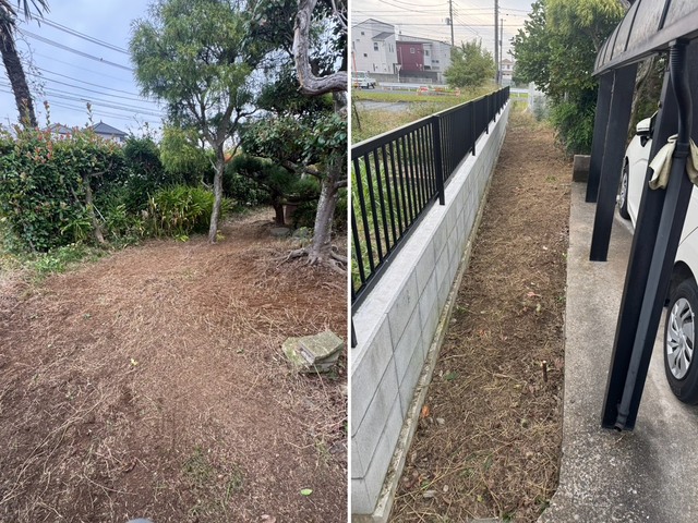 長い間手をつけられなかった場所でしたが、雑草を抜いて落ち葉を集め、すっきりとした印象になりました。 作業後は地面も見えるようになり、全体が明るくきれいになりました。